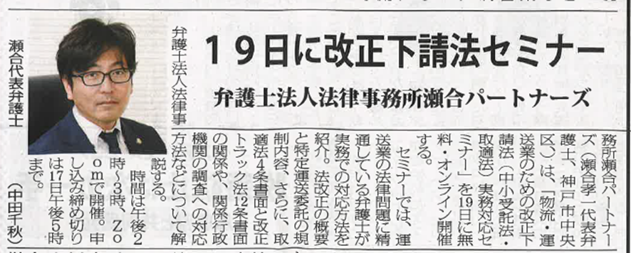 物流業界の専門紙「物流ウィークリー」に当事務所のセミナー活動が紹介されました。
